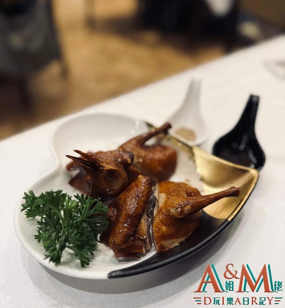 燒過嘅乳鴿外皮香脆,咬開乳鴿外皮之後,肉味伴隨住肉汁蜂擁而出。醬料除左由細食到大嘅淮鹽,中華小館仲另外提供咗喼汁,酸酸哋之中帶有微甜嘅味道,無諗過原來喼汁同乳鴿都match。