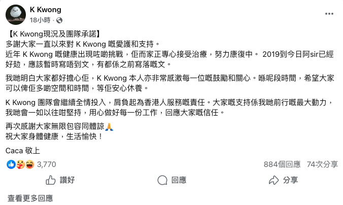 K Kwong團隊在昨晚透過社交平台發表聲明,感謝大眾一直以來的愛護和支持。聲明表示:「近年K Kwong嘅健康出現咗啲挑戰,佢而家正專心接受治療,努力康復中。」並提到他自2019年至今「已經好攰」,暫時無法撰寫新文章。團隊成員Caca在聲明中希望大眾給予K Kwong「多啲空間和時間安心休養」,並承諾團隊會繼續服務香港人,並無提及案件。