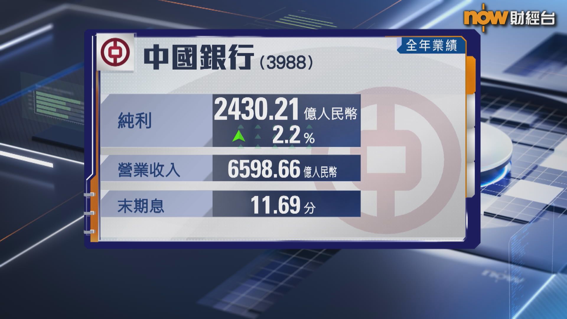 至於中國銀行,全年賺超過2430億元人民幣,按年升超過2%,當中非利息收入增長強勁,令總體營業收入增長超過4%至6598億元人民幣,未期息每股派11.69分,中行去年度淨息差按年亦都跌14個基點,至1.26厘,拖累淨利息收入,但年底的不良貸款比率進一步跌至1.23%。