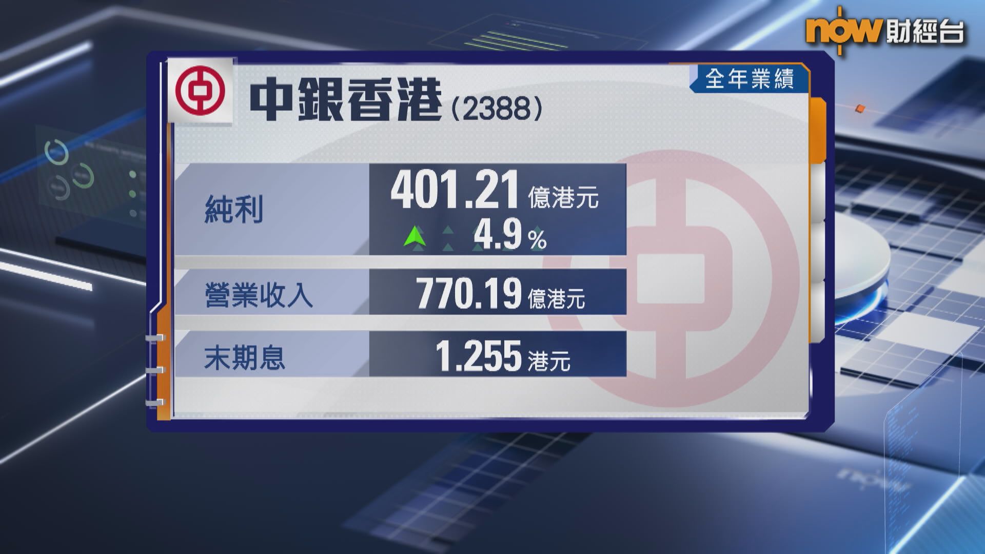 而中行子公司中銀香港股東應佔溢利401億元,按年升近5%,末期息派超過1.255元,連同3次中期息,全年派息2.125元。