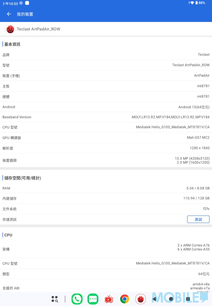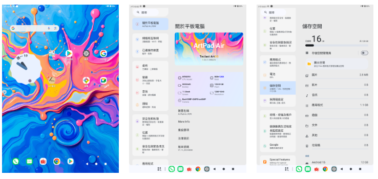 性能配置方面,ArtPad Air 搭載了 MTK Helio G100 處理器,並內建 8GB RAM 及 128GB 儲存空間,更支援虛擬記憶體擴展。這套組合在處理日常社交應用、網頁瀏覽或觀看 1080P 影片時運作平穩,沒有出現明顯的遲滯感。不過用家需留意,由於處理器定位屬於入門級別,若執行大型 3D 遊戲或處理高負載的剪輯工作,效率會相對受限。系統方面則採用了接近原生的 Android 15,介面乾淨且沒有過多預裝的第三方軟件,這對提升整體反應速度有很大幫助。
