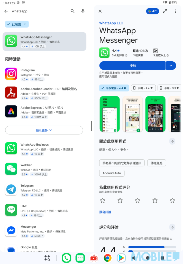 ▲而且於 Play 商店上,更可以直接安裝 WhatsApp 於平板上使用。