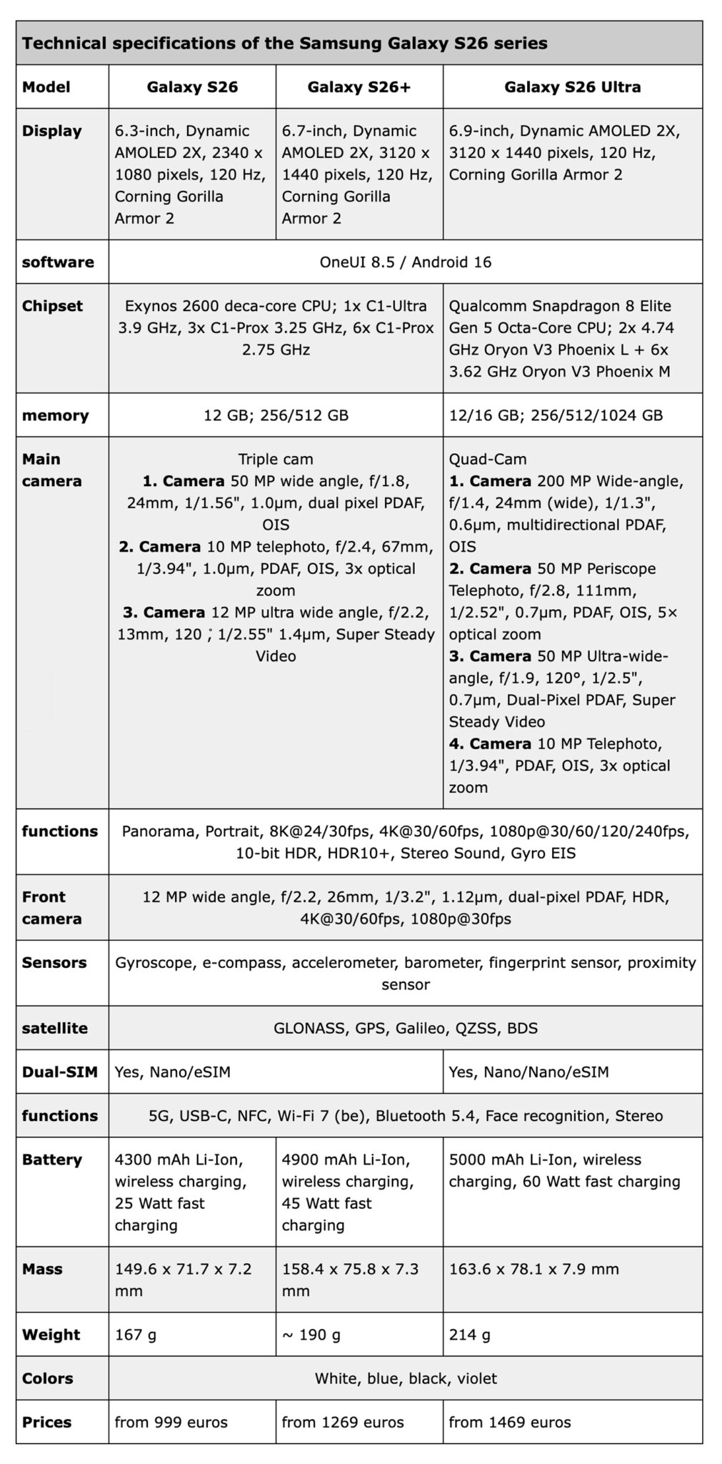 Galaxy S26 / S26+ / S26 Ultra 詳細規格表流出!保留 12GB RAM 標配、這地區 S26 / 26+ 用 Exynos