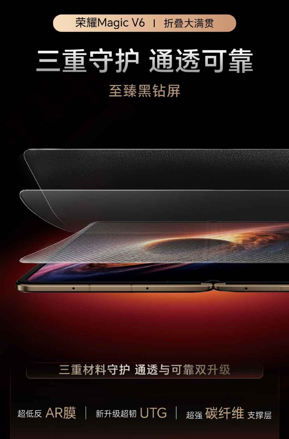 【MOBILE】HONOR於 MWC 發表新一代摺疊旗艦 Magic V6 後,這部挑戰輕薄極限的作品即將回歸國內市場。除了機身厚度與電池容量打破紀錄,Magic V6 最受關注的技術突破,莫過於其採用的「4 合 1 顯示玻璃」塗層方案。這項新技術旨在徹底取代傳統鋼化膜,透過物理結構的改變,讓螢幕玻璃本身具備極強的外殼防禦力。
