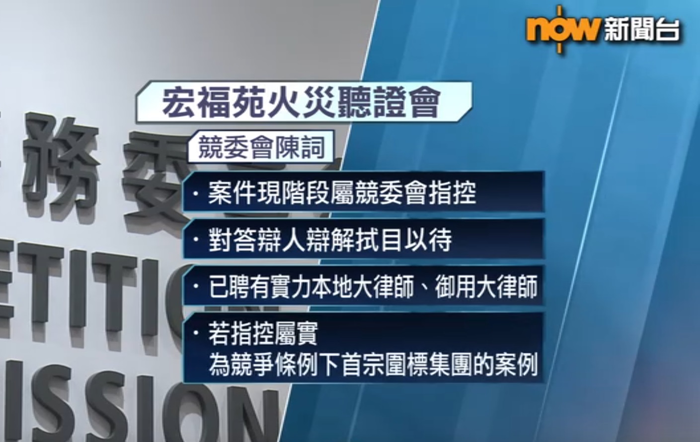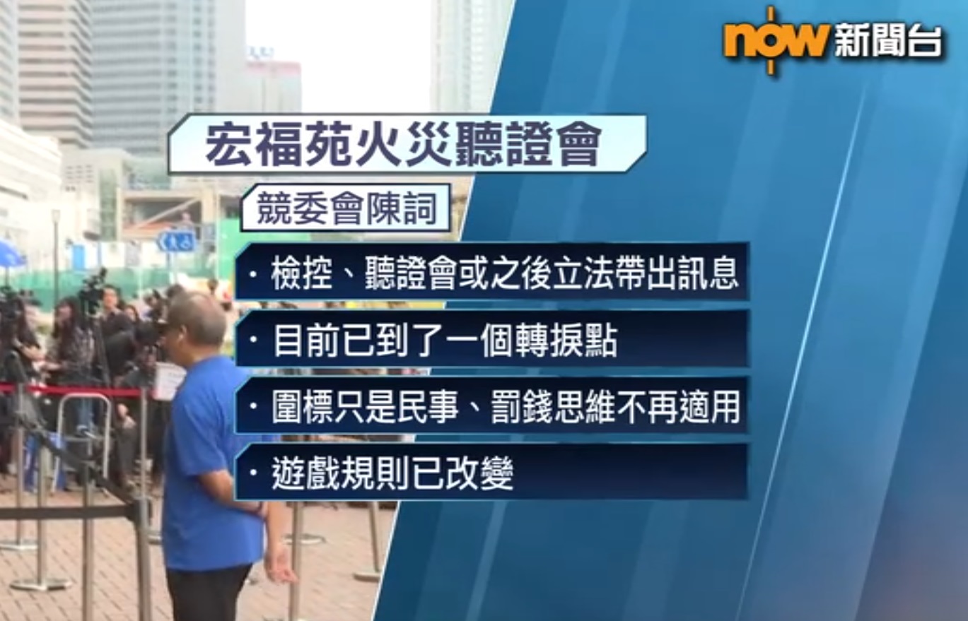競委會的代表大律師李曉亮在宏福苑火災獨立委員會聽證會陳詞提到,檢控未包括事件中兩個主角承建商宏業及工程顧問公司鴻毅,是因為調查未完成,亦不排除宏福苑大維修出現兩個或以上圍標集團,之後可能會進一步檢控,希望公眾給予耐性,又指案件現階段是競委會的指控,答辯人未有機會辯解對辯解拭目以待,已聘請有實力的本地大律師及御用大律師在案件代表競委會,若指控屬實,會是在競爭條例下首宗圍標集團的案例。