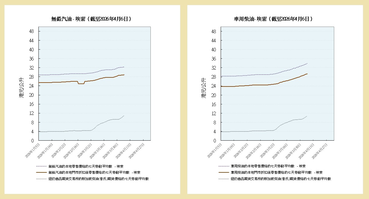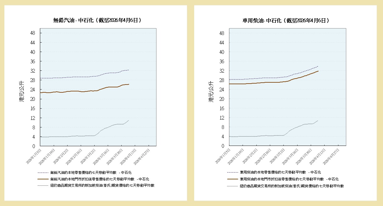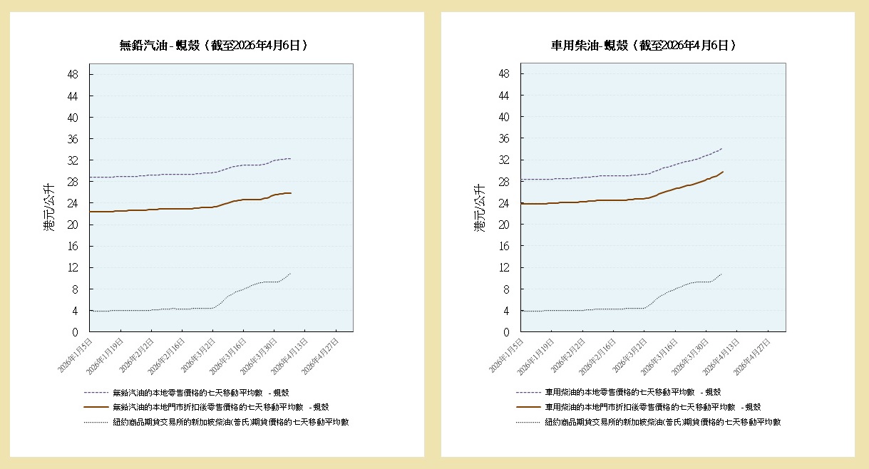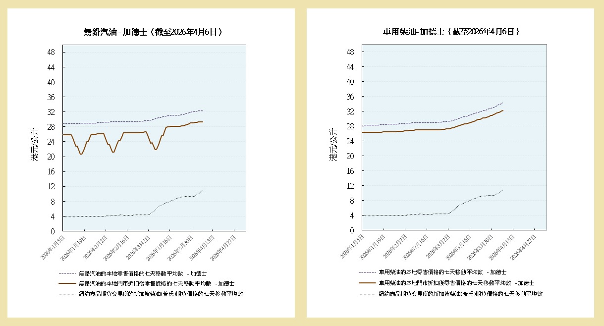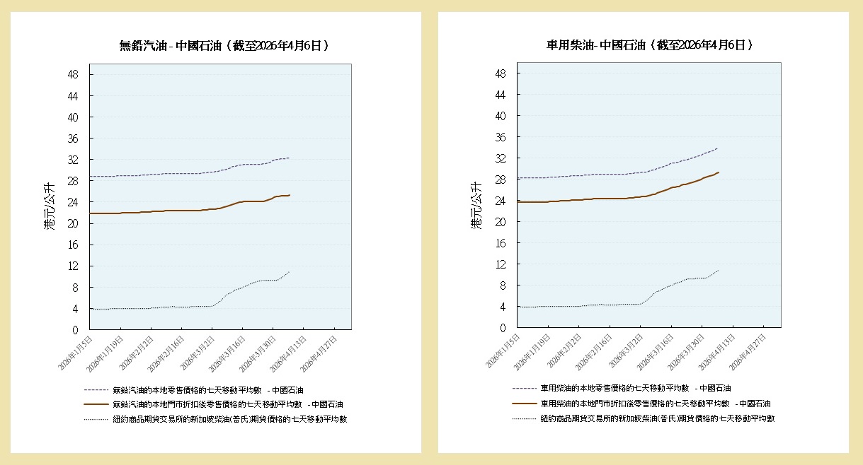 政府發布每周車用燃油價格(4月8日更新) 政府發布每周車用燃油價格(4月8日更新) 2026年4月8日 15:30 【Now新聞台】由2026年4月1日起,環境及生態局會每周向公眾發布各油公司無鉛汽油和柴油折扣後零售價和同期國際成品油的市場指標價格走勢,協助公眾監察本地各油公司零售價和國際成品油價的走勢、是否同步和差距等。 更新日期:2026年4月8日 加德士 埃索 中國石油 蜆殼 中石化 更新日期:2026年4月1日 加德士 埃索 中國石油 蜆殼 中石化 關於政府電力、煤氣公司、車用燃油零售價及家用石油氣價格的監察,可按此查閱。