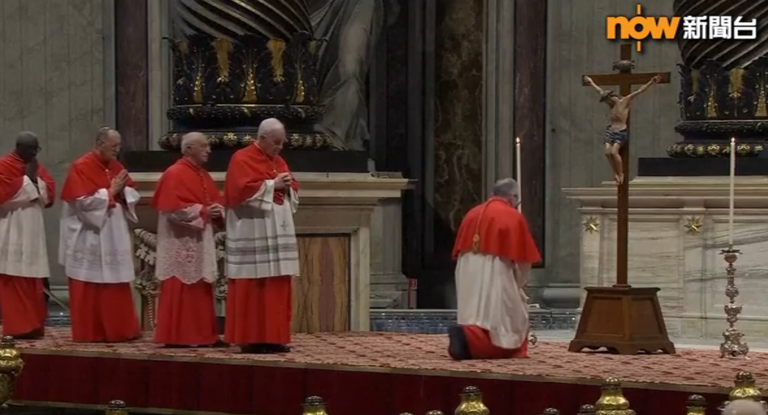 十字架隨後領進大殿,多名樞機逐一上前親吻,良十四世再跪拜十字架,並將其抬起面向信眾。