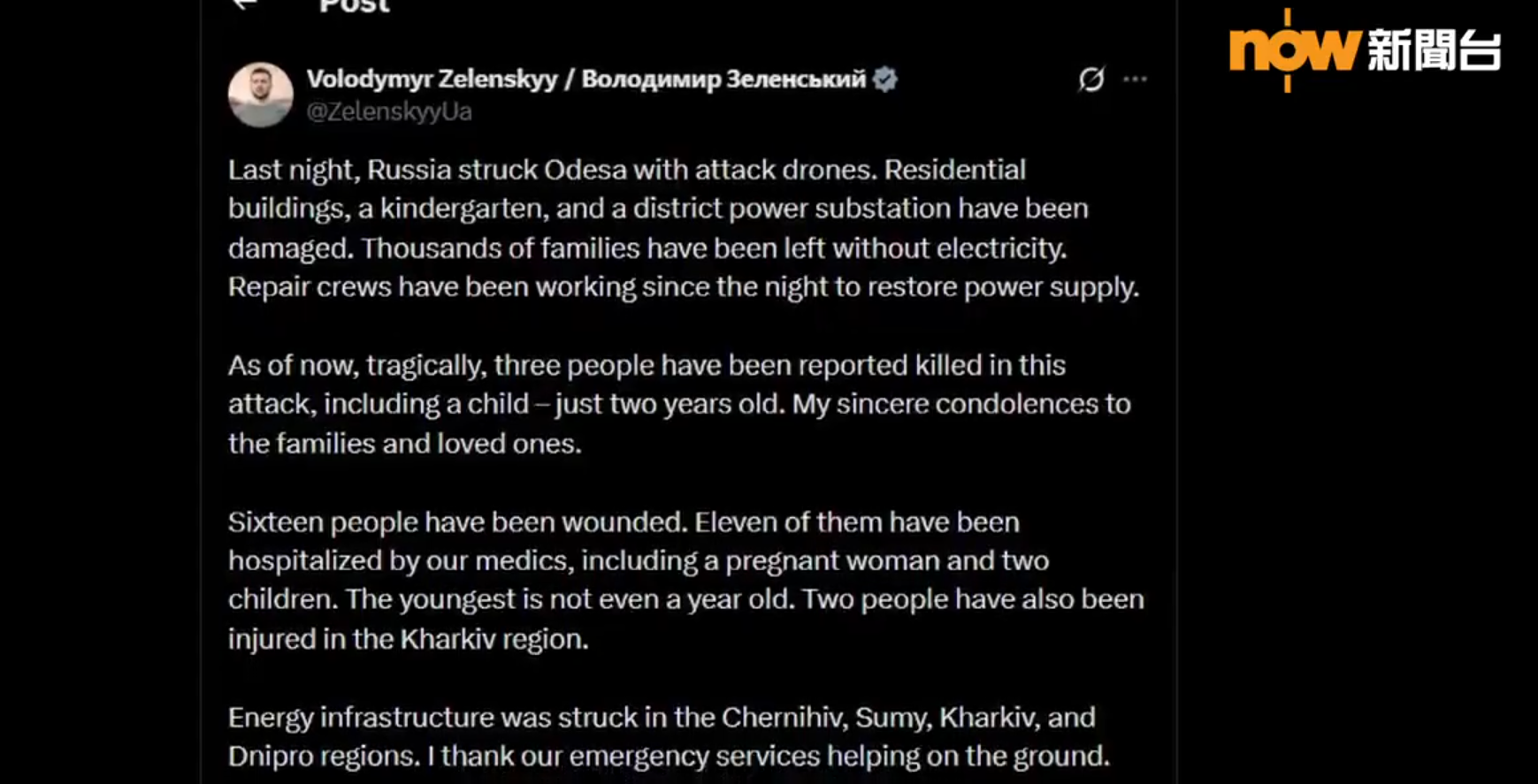 【Now新聞台】俄羅斯連夜攻擊烏克蘭南部城市,造成三人死亡、多人受傷,當中包括兒童。烏克蘭總統澤連斯基受訪指,外界焦點集中於伊朗戰事,擔心若衝突持續,會減少烏克蘭得到的支援。