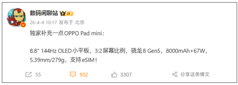 【MOBILE】隨著行動辦公與高規格遊戲需求的增長,市場對於細尺寸平板的呼聲日益增高。近日市場流出關於 OPPO 首款性能型細平板 OPPO Pad mini 的詳細規格資訊,這款新機預計將於本月與年度旗艦手機 OPPO Find X9 Ultra 同台發表!
