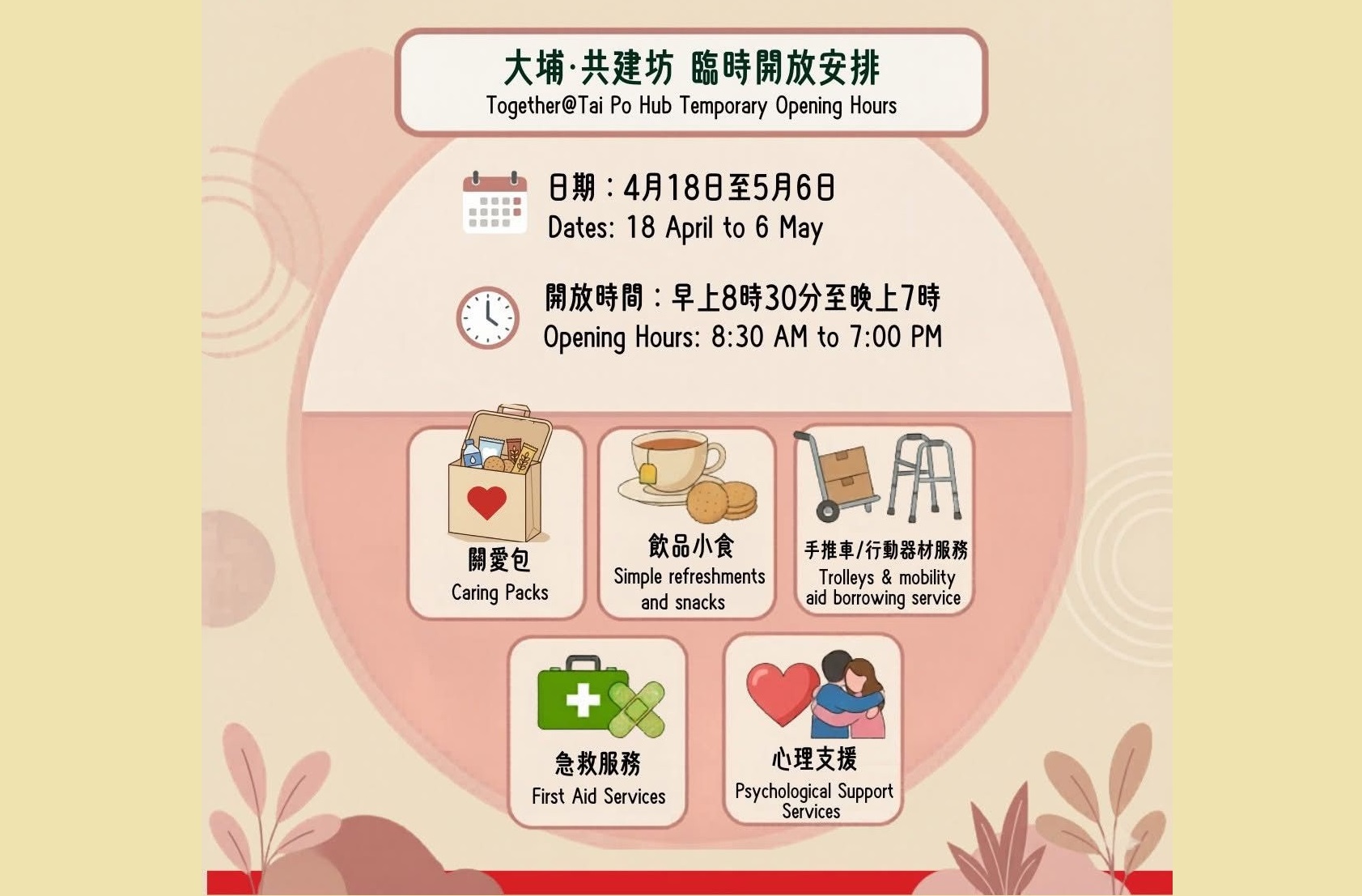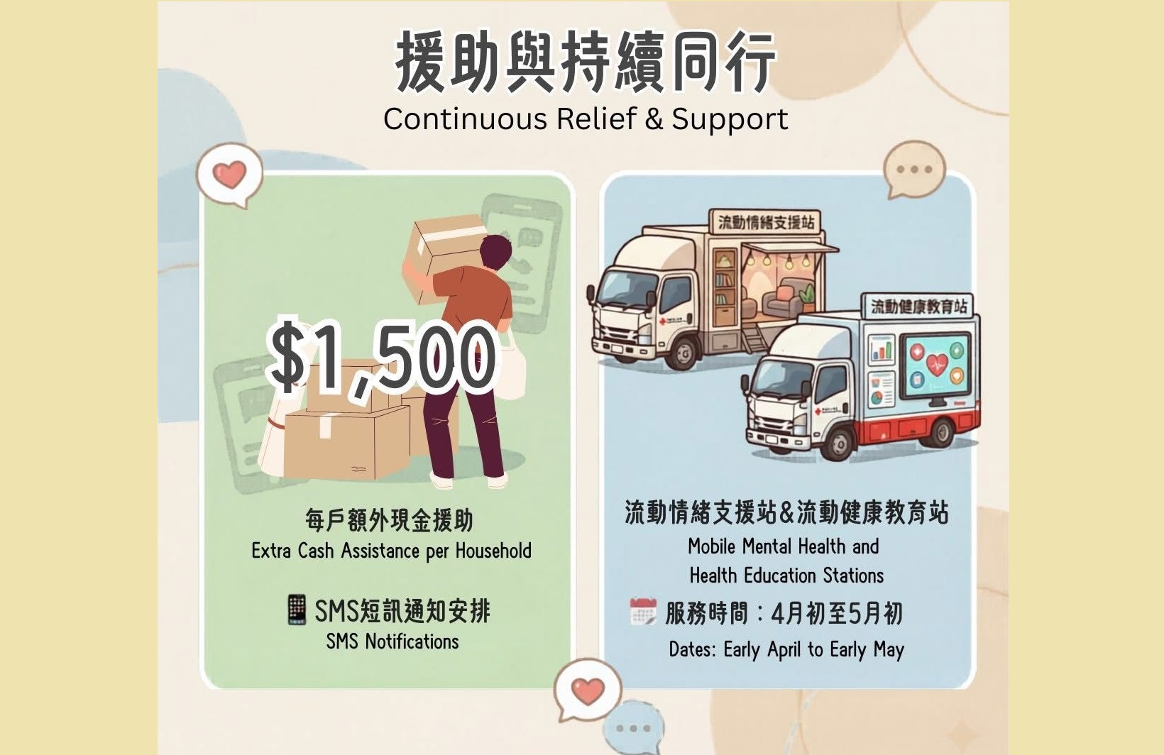 此外,香港紅十字會將延續緊急及復原現金援助計劃,向每戶額外派發1500港元,支援居民上樓收拾和搬運開支,本地賑災團隊將以短訊(SMS)通知有關安排。另外,本月初至5月初,流動情緒支援站及流動健康教育站亦會繼續出動服務。
