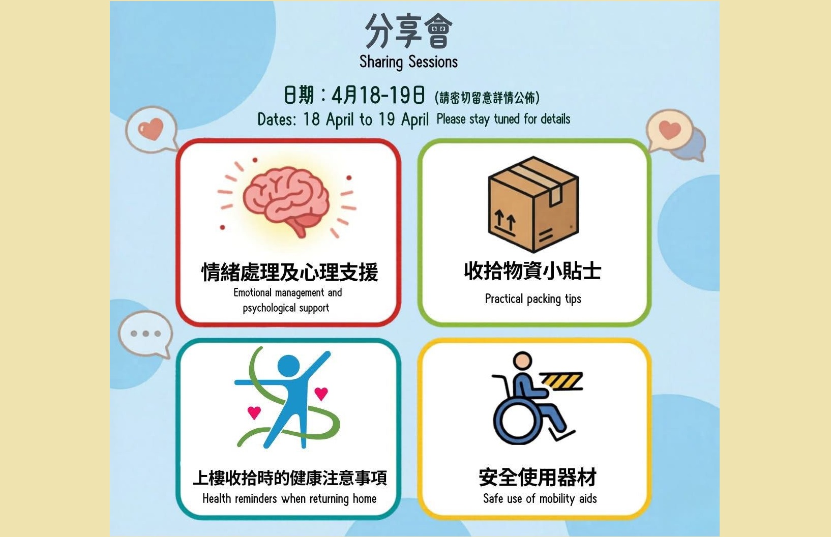 另外,香港紅十字會在本月18日至19日,將在「大埔.共建坊」舉辦分享會,為居民於上樓收拾前提供最全面的準備,包括情緒處理及心理支援、安全使用行動輔助器材、收拾物資小貼士,以及上樓收拾時的健康注意事項。