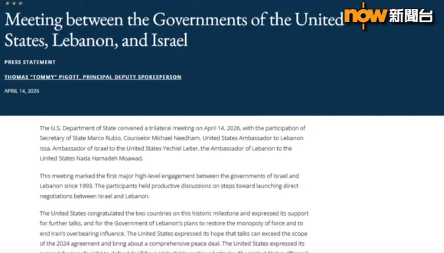 【Now新聞台】以色列與黎巴嫩的駐美國大使在華盛頓舉行直接會談,是逾30年來首次。與會各方形容會談氣氛正面,並富有成效,他們同意在以黎雙方商定的時間及地點,正式啟動直接談判。