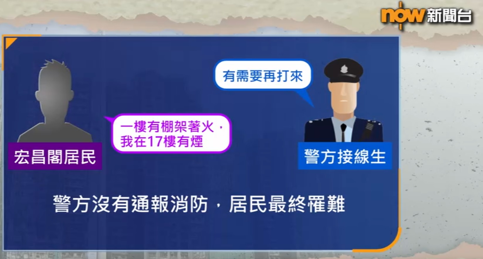 會上亦播放了多段錄音,其中一名住在宏昌閣17樓的居民稱一樓有棚架著火,警方接線生稱「有需要再打來」。警方沒有通報給消防,而該名居民最終罹難。