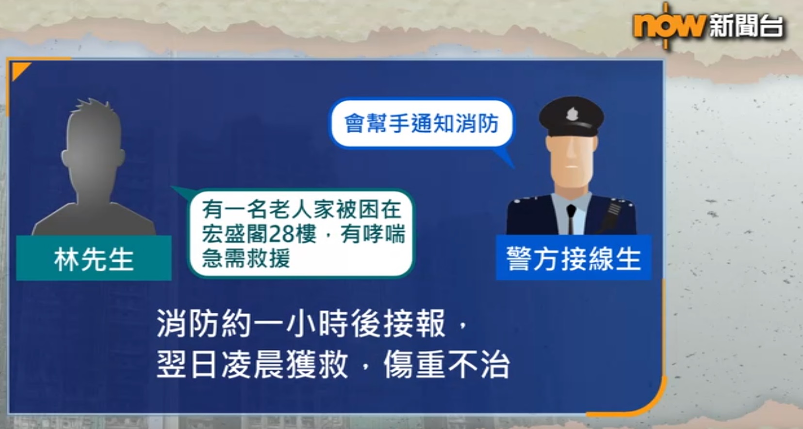 另一位求助人亦報稱有一名老人家被困在宏盛閣28樓,本身有哮喘、急需救援。接線生稱「會幫手通知消防」,之後會收線。消防在約一小時後接報,翌日凌晨老人家獲救,最終傷重不治。