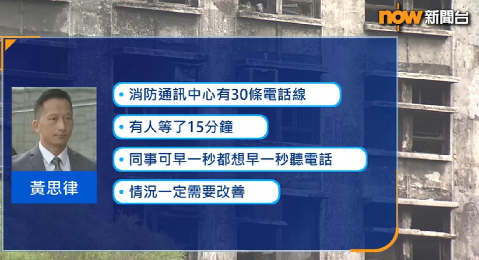 黃思律亦確認消防通訊中心只有30條電話線,當日有人等了15分鐘,提到當時的同事明白事件急切,可以早一秒都希望早一秒聽電話,情況一定需要改善,無論是人手、硬件、技術,都希望可以把運作能力提高。