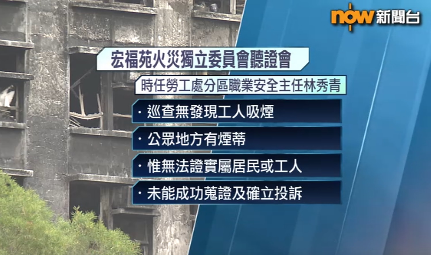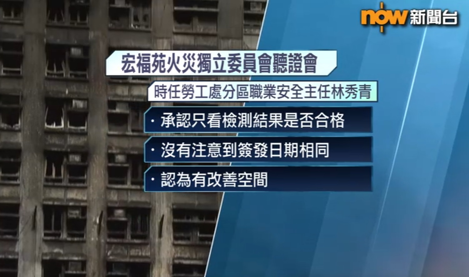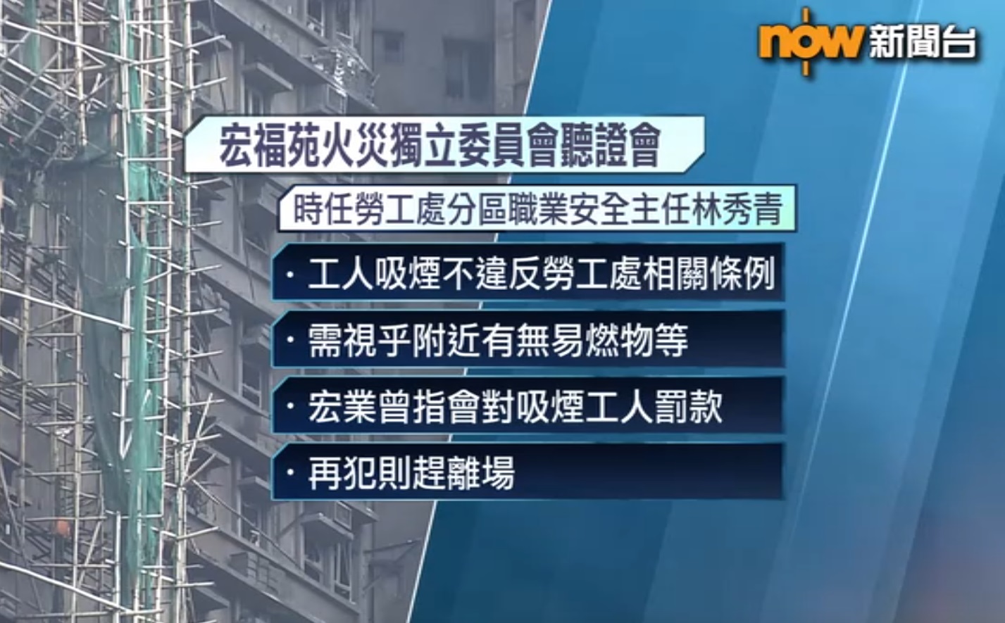 【Now新聞台】宏福苑火災獨立委員會繼續舉行聽證會。勞工處代表作供稱,曾多次突擊巡查及發現煙蒂,但無證據證明屬於工人,又承認無留意到承建商宏業用舊的棚網阻燃證書蒙混過關。