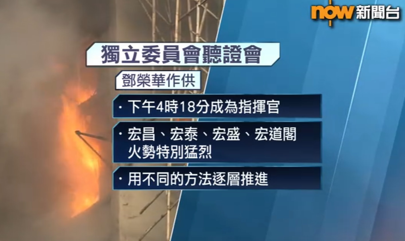 助理處長鄧榮華作供則指,自己在大火當日下午4時18分成為現場指揮官,當時7幢建築物起火,宏昌、宏泰、宏盛、宏道閣火勢特別猛烈,每座都有獨立指揮官,他們都用不同的方法逐層推進,形容當時是想盡所有方法救出被困的人。有消防員為了進入宏昌閣,一邊面對不斷跌落的火柱,一邊移開竹枝,終於成功找到一條狹窄的通道,進入大堂救了3名昏迷的人。