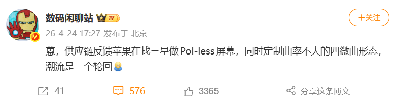 這項傳聞指出,Apple 目前正與 Samsung 顯示部門緊密合作,共同開發這塊特殊的螢幕面板。值得留意的是,這款新型面板將採用無偏光片(POL-less)技術,不僅能有效降低屏幕厚度,使其更為纖薄,還能進一步提升顯示亮度與節能表現。雖然無偏光片技術並非首次出現在智能手機市場,但 Apple 顯然希望透過自定義的曲率半徑,打造出不同於以往產品的視覺手感。