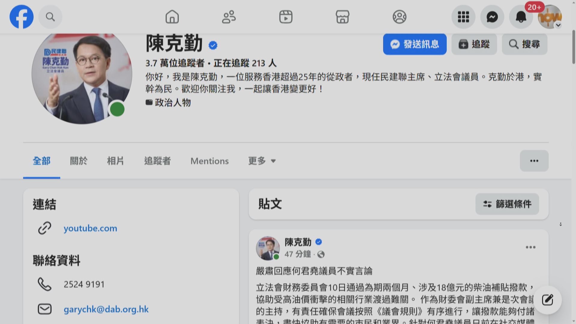 【Now新聞台】立法會財委會副主席陳克勤發文反駁內會副主席何君堯,批評對方在周五財委會會議後發表了與事實不符的攻擊言論,對此深感遺憾及失望。