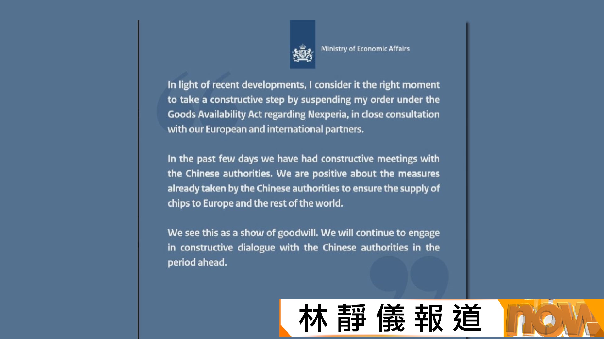 【Now新聞台】中國與荷蘭政府就安世半導體問題展開磋商,荷方在會談後宣布暫停接管安世半導體的行政命令,中方表示歡迎,但與撤銷行政命令仍有差距,希望荷方繼續展現與中方真誠合作意願,歐盟亦歡迎荷蘭的決定。