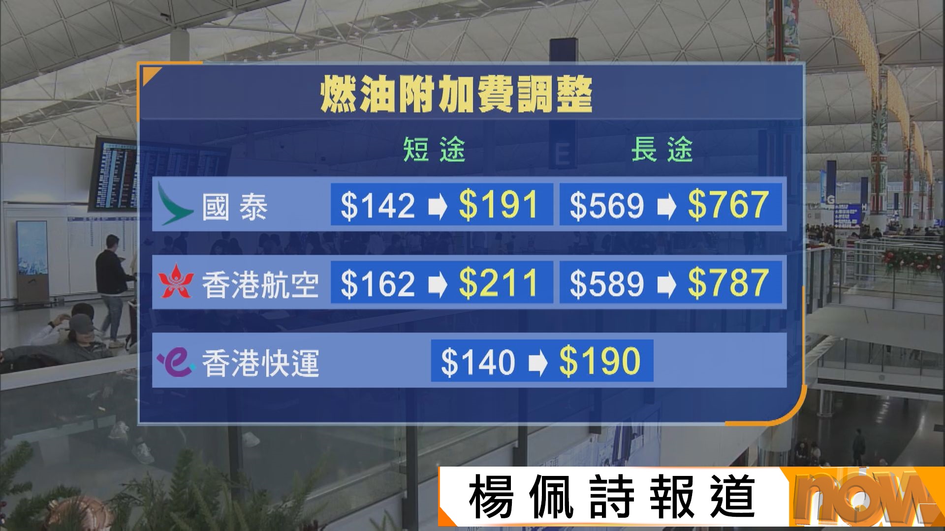【Now新聞台】機場有不少旅客出發到外地跨年,元旦起,本地多間航空公司上調客運燃油附加費,不少旅客認為加幅太大。