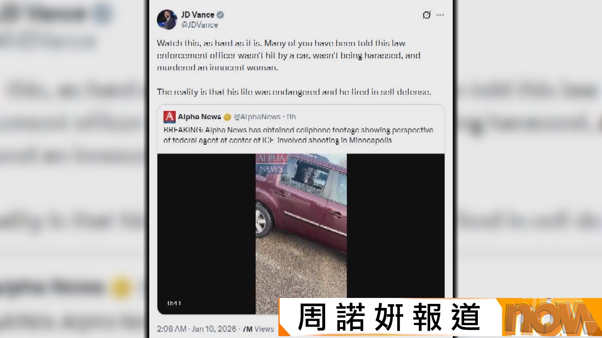 【Now新聞台】美國移民與海關執法局人員在明尼蘇達州開槍擊斃女子古德的事件,最新曝光片段見到她曾駕車駛近執法人員,聯邦政府拒絕與州政府合作調查,州政府表示會另行展開刑事調查。