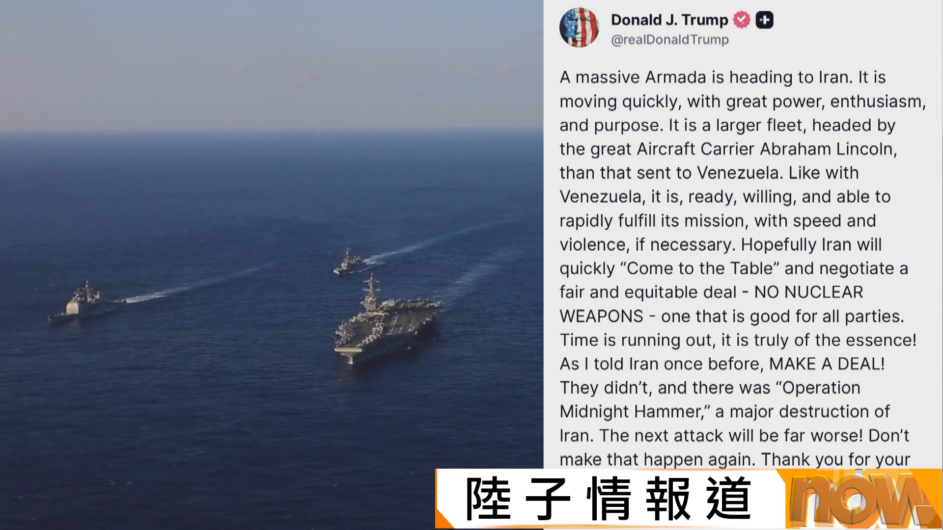 【Now新聞台】美國總統特朗普警告,若伊朗不放棄核武並重返談判,美國將發動強力打擊。外電消息指,方案包括直接空襲伊朗領導層。而德黑蘭則警告會視美國軍事行動為開戰,並將打擊以色列作反擊。