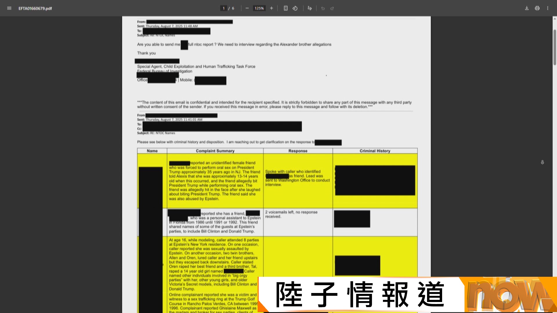 【Now新聞台】美國司法部再公開300萬頁已故富商淫媒愛潑斯坦性交易案調查資料,規模是歷來最大,美國總統特朗普圈子中有多人均被指有與愛潑斯坦保持來往,包括曾與愛潑斯坦劃清界線的商務部長盧特尼克、富商馬斯克。