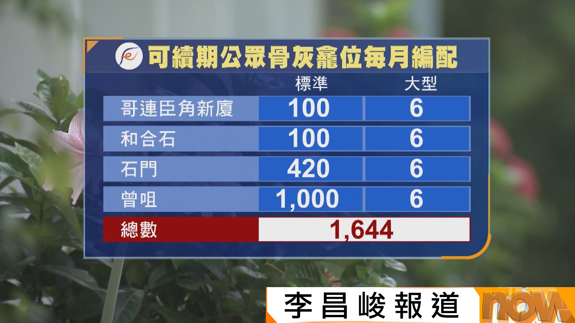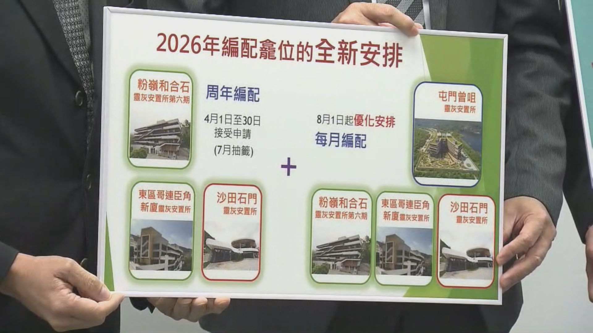 【Now新聞台】和合石、哥連臣角新廈及石門靈灰安置所骨灰龕位編配,8月起會由周年編配改為每月編配。