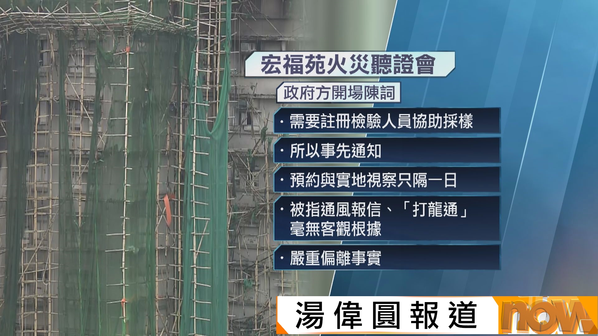 【Now新聞台】宏福苑火災獨立委員會舉行第三場聽證會。政府一方陳詞指,房屋局獨立審查組事先通知承建商檢測棚網,是要預約檢驗人員在場協助,澄清並非通風報信。