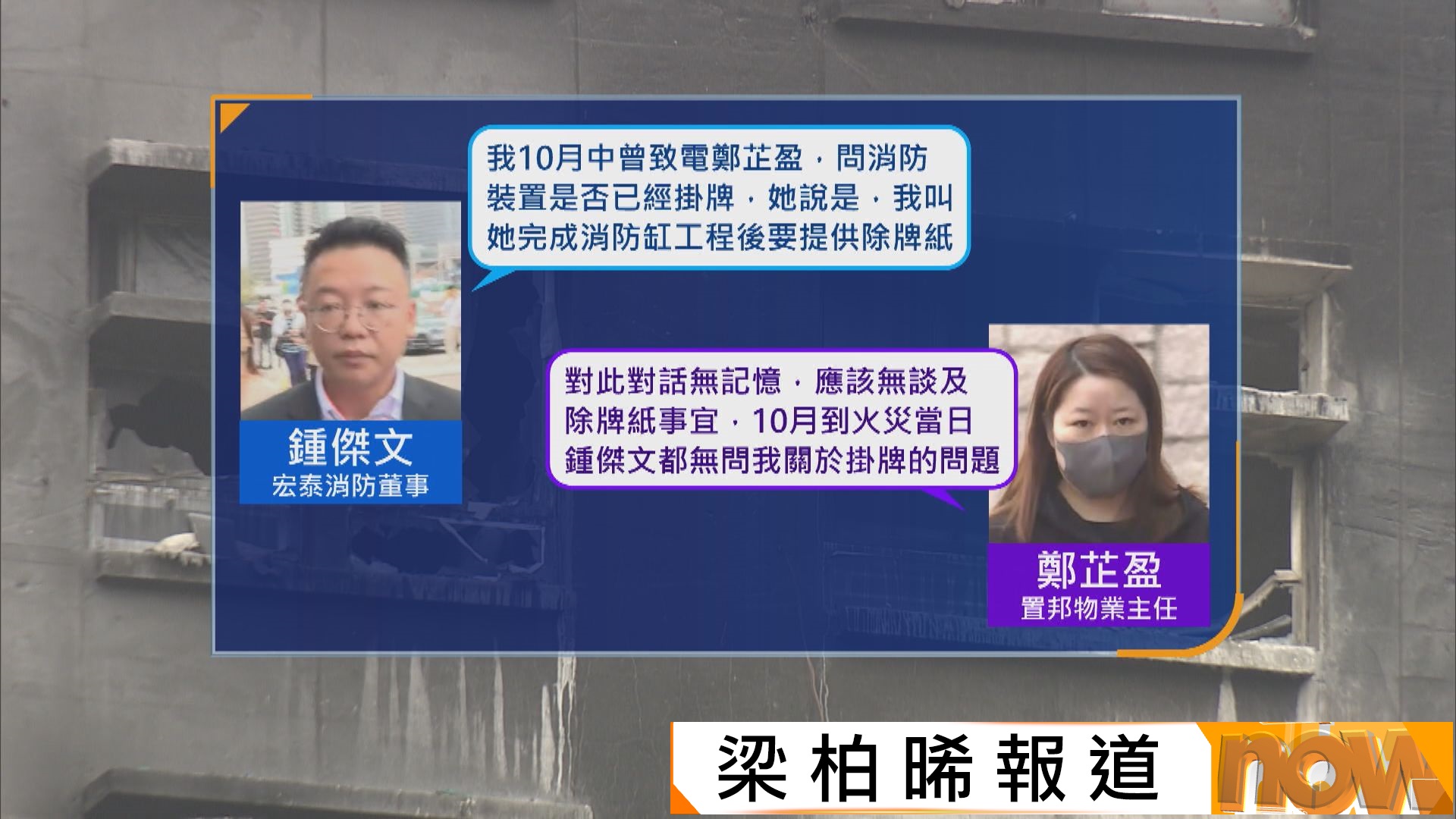 【Now新聞台】宏福苑火災獨立委員會舉行第八場聽證會。物管公司工程主任指,宏泰消防董事鍾傑文火災當日才首次向他索取掛牌紙;物業主任則指無向宏泰提及掛牌事宜,與鍾傑文的說法有矛盾。