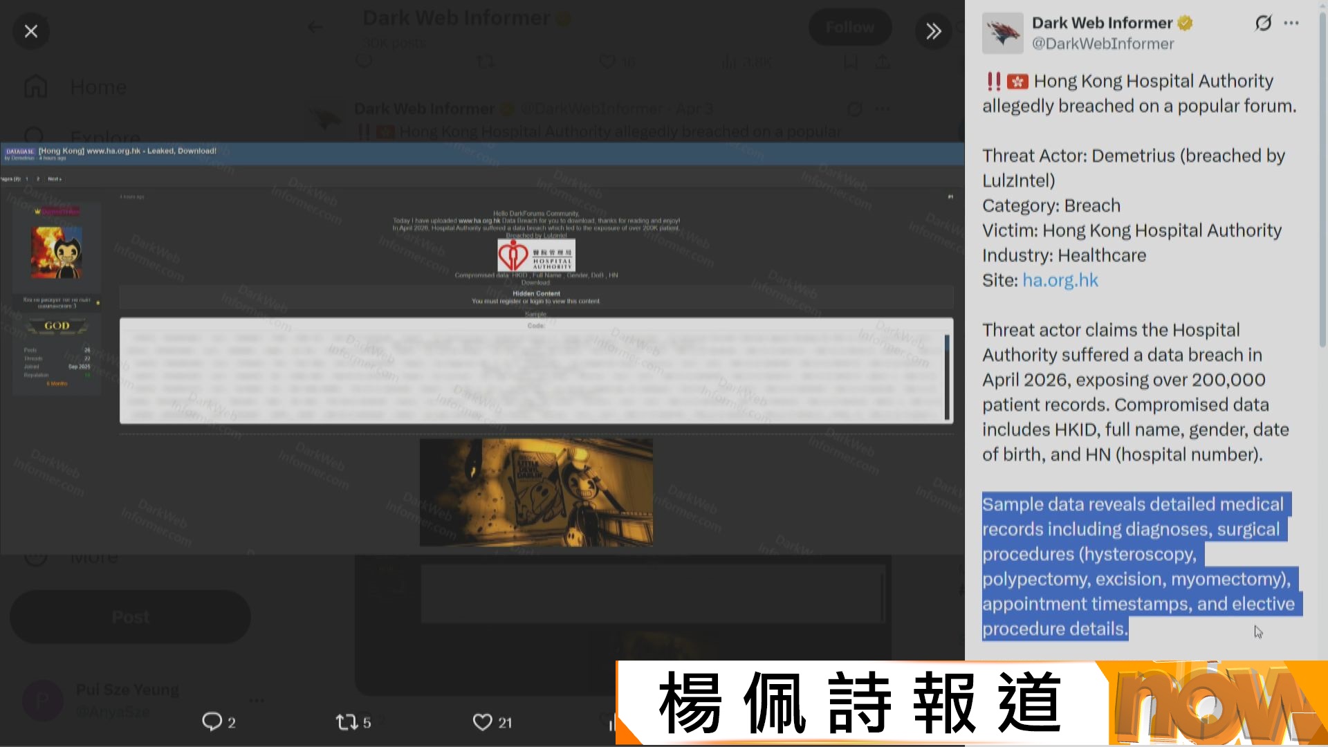 【Now新聞台】九龍東醫院聯網超過5.6萬名病人資料外洩,包括姓名、身份證號碼、手術內容等。醫管局就事件致歉,行政總裁向員工發信,指懷疑有人非法盜取資料。警方指,收到醫管局報案,交由網絡安全及科技罪案調查科跟進,暫未有人被捕。