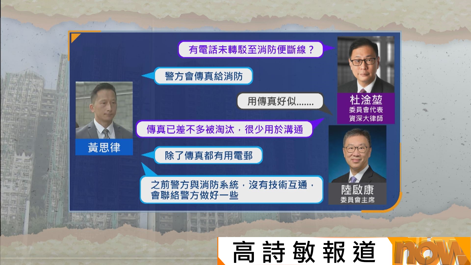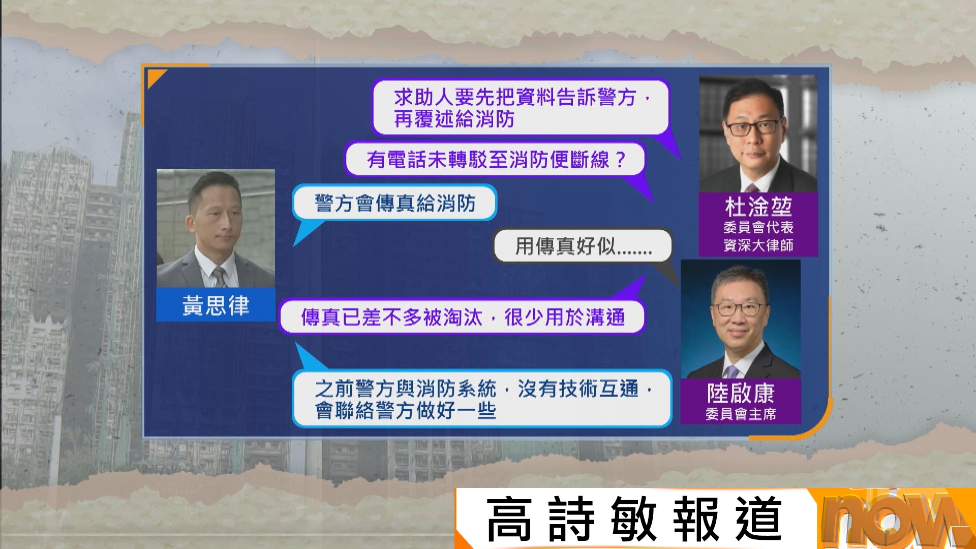 【Now新聞台】宏福苑第12場聽證會,副消防總長黃思律作供,承認有求助人打999後等了15分鐘才獲消防接聽,若無被轉駁至消防便斷線,警方會傳真資料給消防,他認為應該考慮接駁警方及消防的系統。
