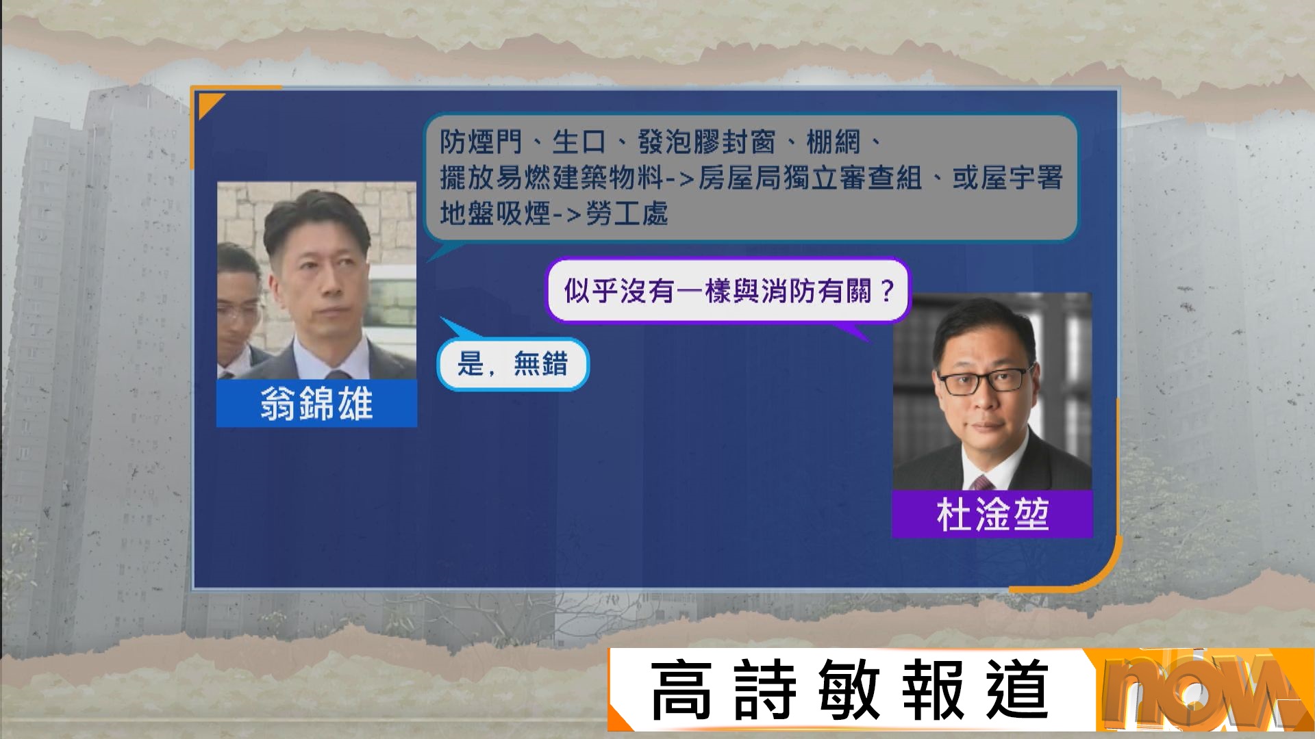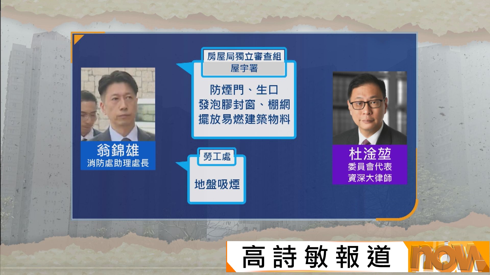 【Now新聞台】宏福苑火災獨立委員會繼續舉行聽證會。勞工處代表作供稱,曾多次突擊巡查及發現煙蒂,但無證據證明屬於工人,又承認無留意到承建商宏業用舊的棚網阻燃證書蒙混過關。