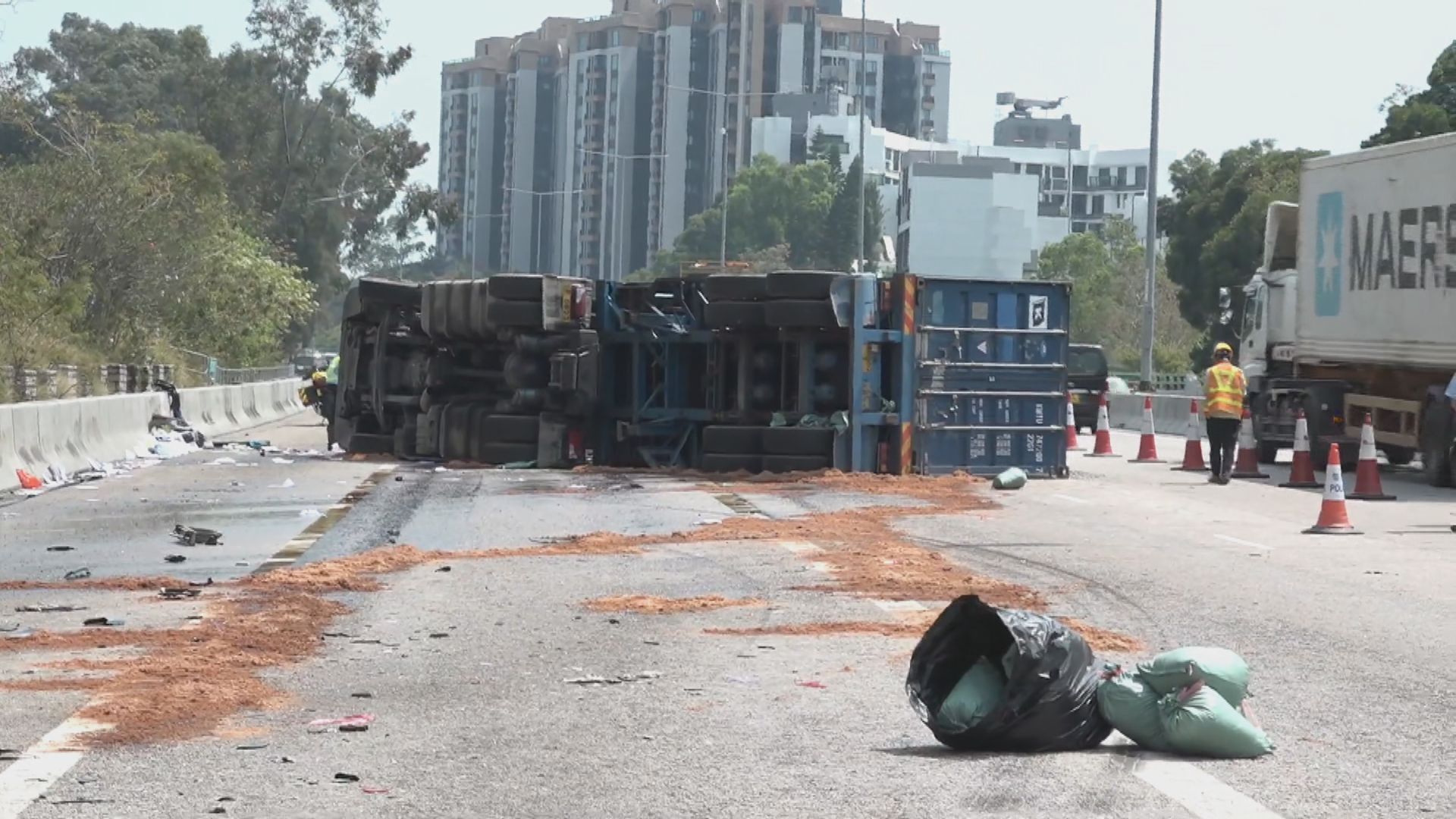【Now新聞台】屯門公路有貨櫃車與消防車相撞後翻側,貨櫃車司機昏迷送院。