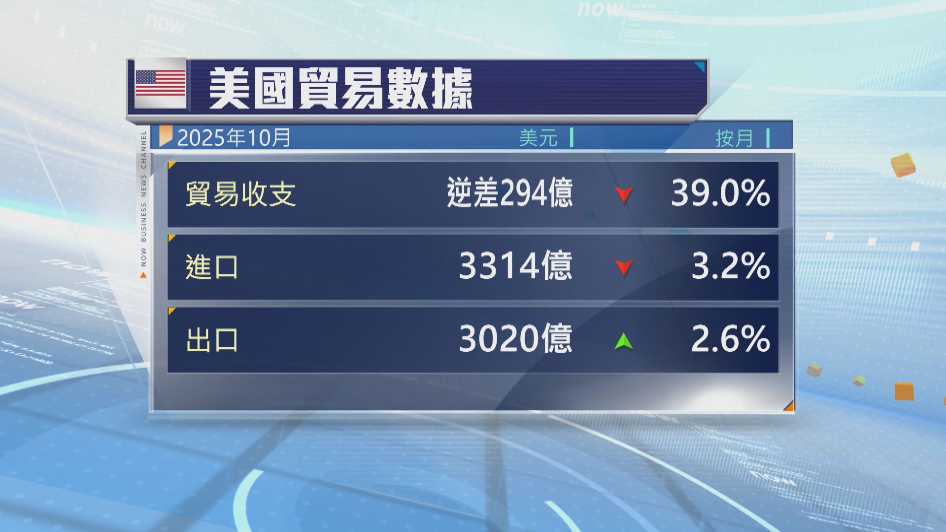 【Now新聞台】美國去年10月貿易赤字跌至逾十六年來最低。