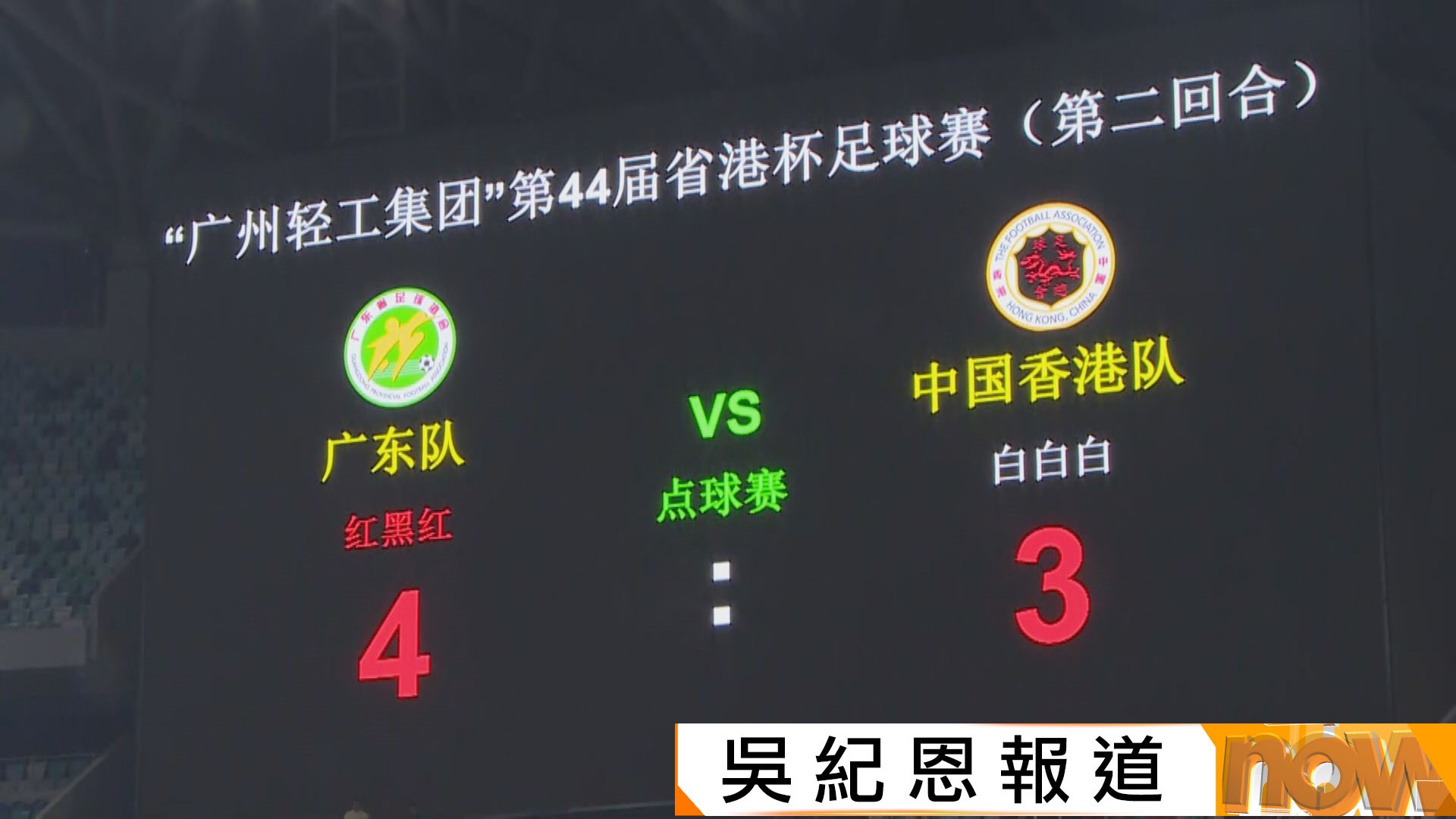 【Now新聞台】省港盃足球賽,港隊作客廣東,落後兩球下扳平,兩回合總成績4比4,互射十二碼,港隊輸3比4,連續三屆落敗,廣東第27次奪標。