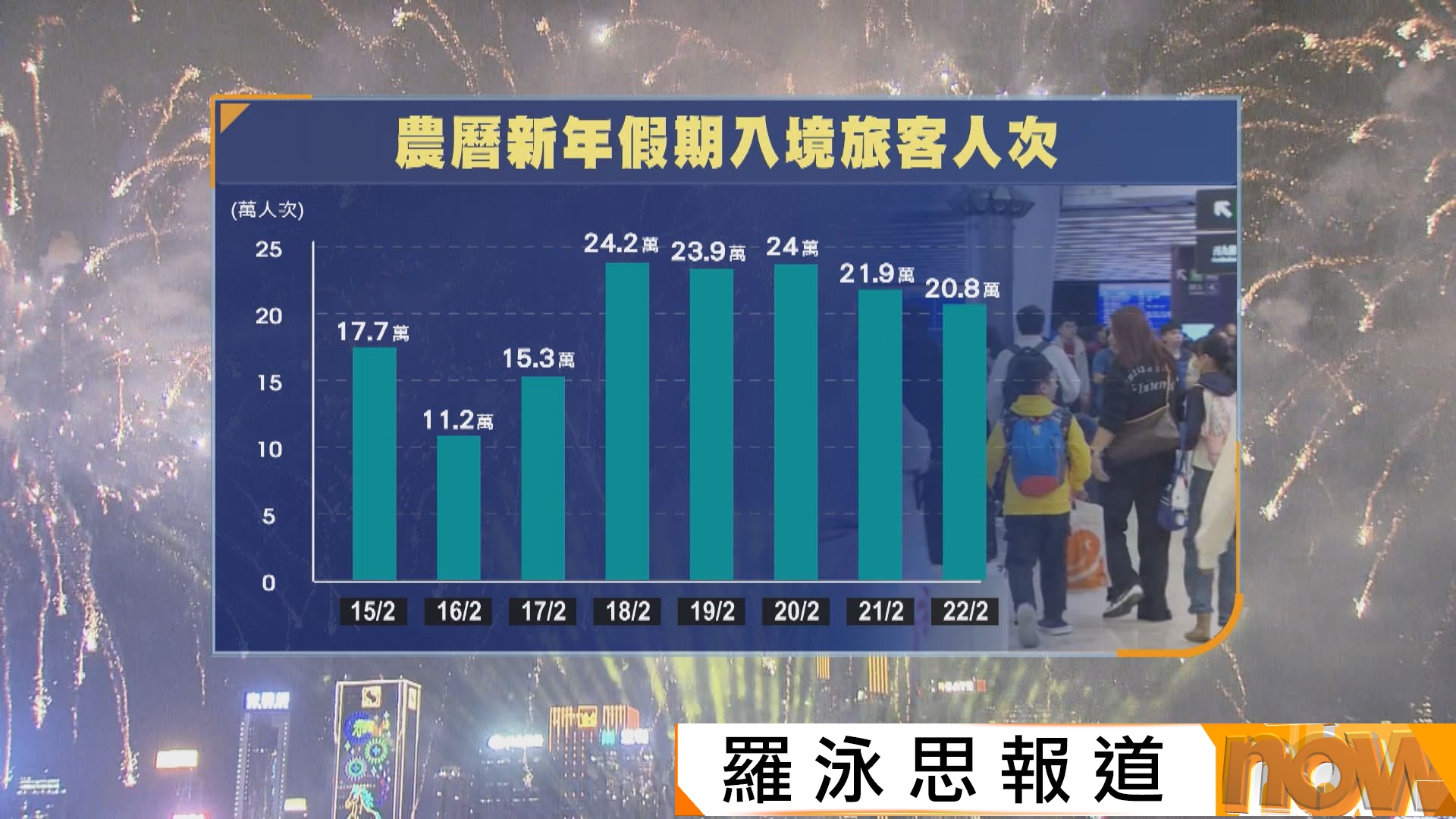 【Now新聞台】內地春節黃金周接近尾聲,本港過去八天共有近160萬人次旅客訪港,其中內地旅客佔八成多。旅議會主席譚光舜稱,樂見訪客有增長,並平均留港超過3晚。