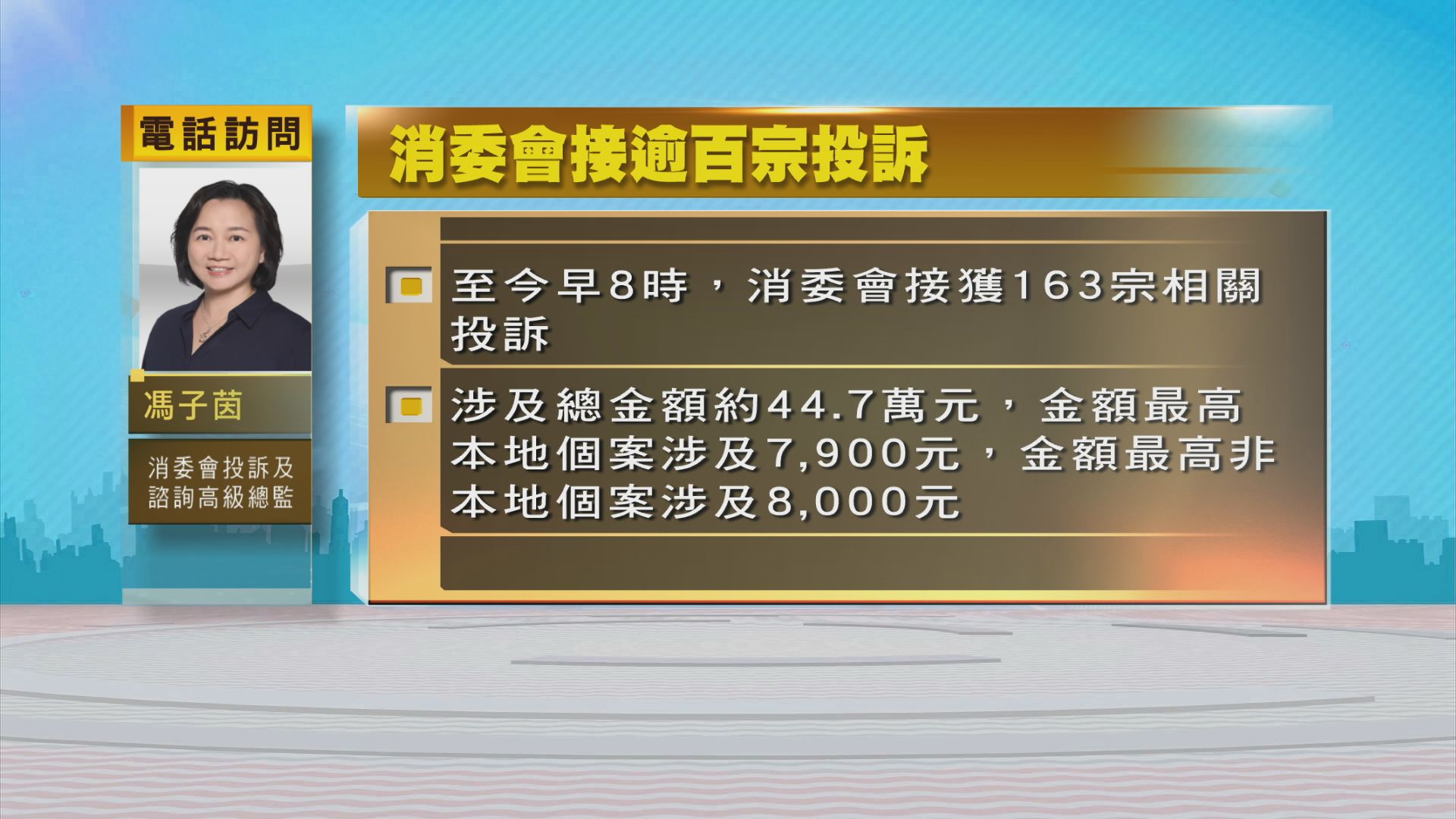 【Now新聞台】台灣樂團五月天發售本月24日在啟德主場館頭場演唱會後取消,引起不滿,主辦方最新改為當天安排40分鐘「綵排特別場」。消委會稱,截至今早八時,共接獲163宗投訴,大部分為內地人,涉款逾44萬7千元,正積極與主辦單位跟進事件。