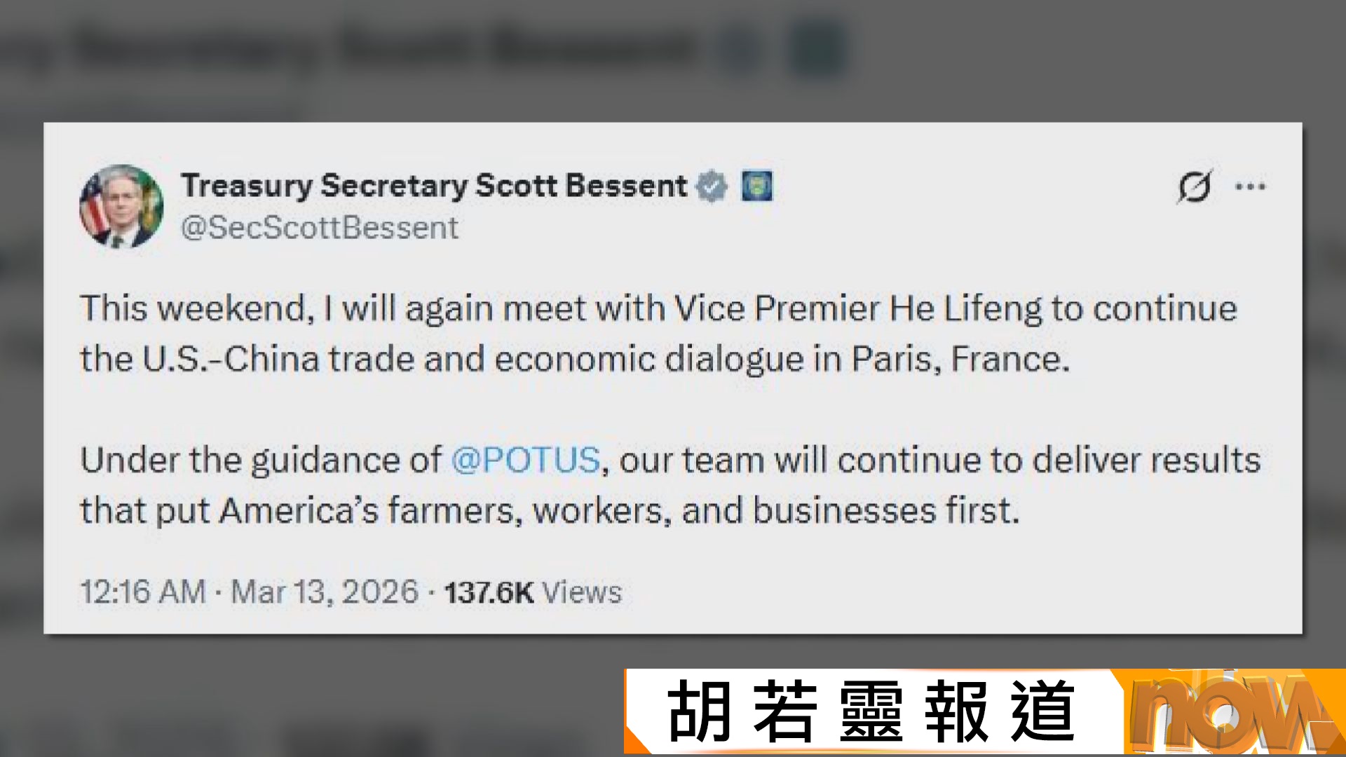 【Now新聞台】國務院副總理何立峰將於周六至下周二,率團到法國與美方舉行經貿磋商。