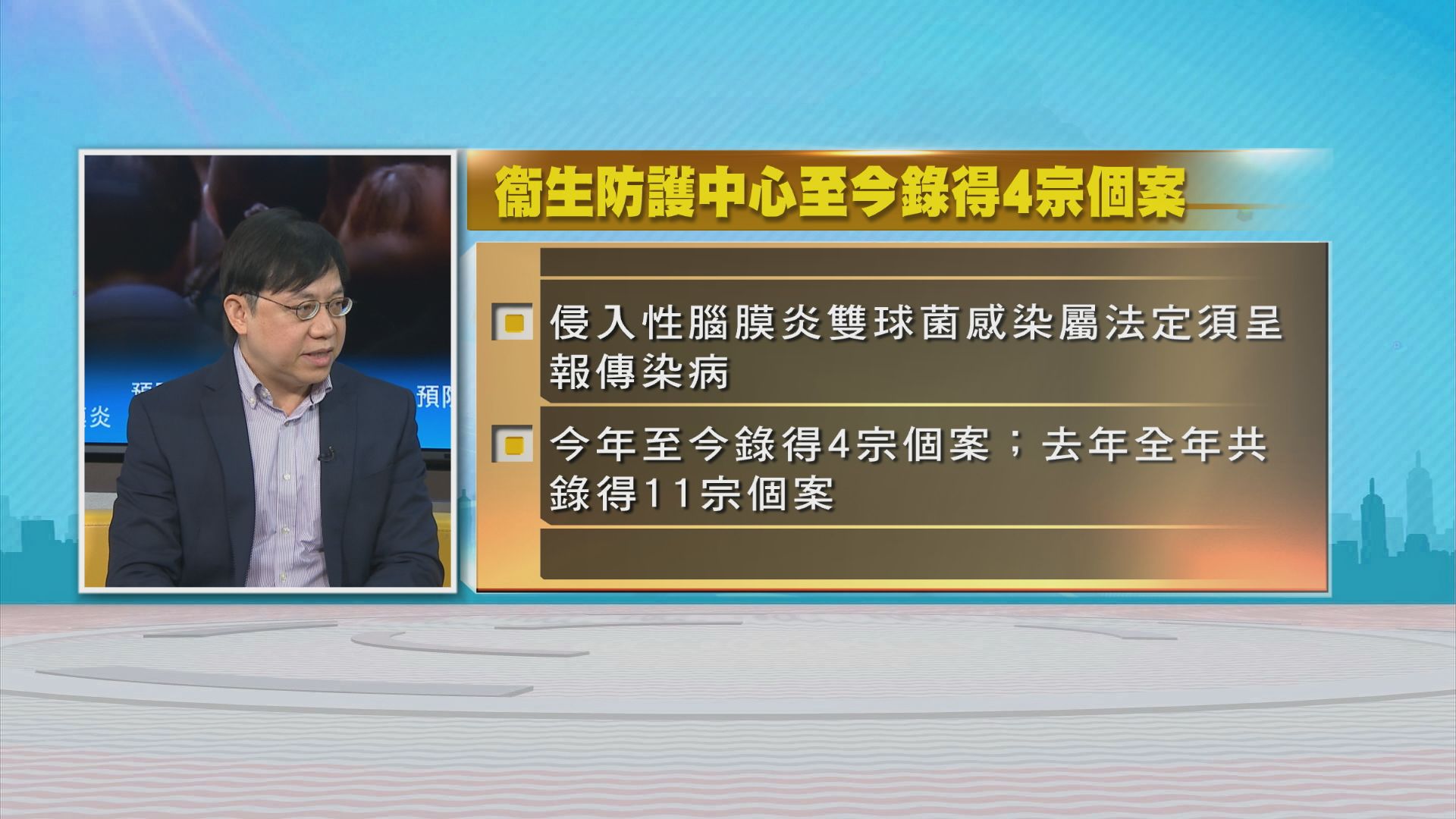 【Now新聞台】衞生防護中心傳染病處主任歐家榮在本台節目《時事全方位》表示,本港的腦膜炎病發率屬低水平,但建議免疫力低或將到高風險地區外遊的人士應該接種疫苗。