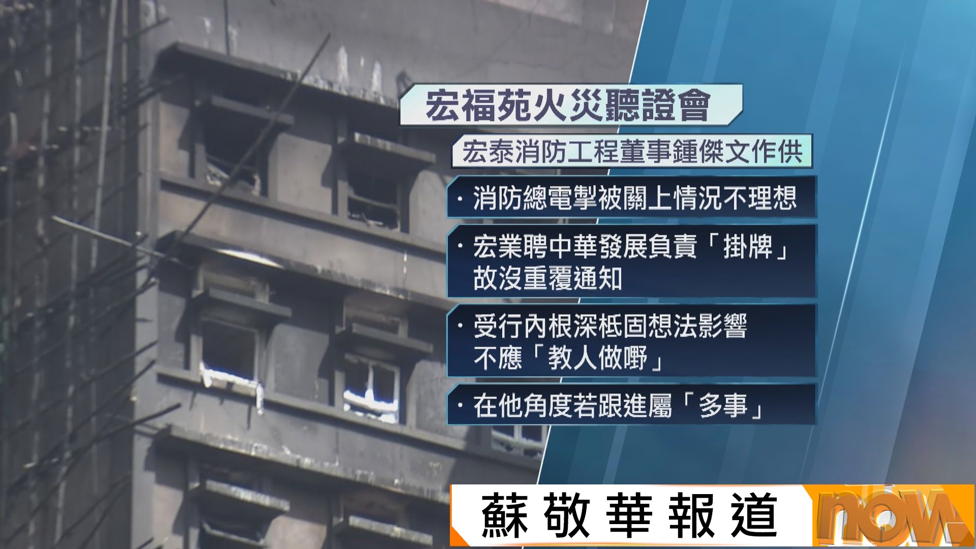 【Now新聞台】宏福苑消防設備承辦商宏泰消防工程的員工亦有在聽證會作供,指大火前已發現宏福苑的消防系統總電掣被關閉。