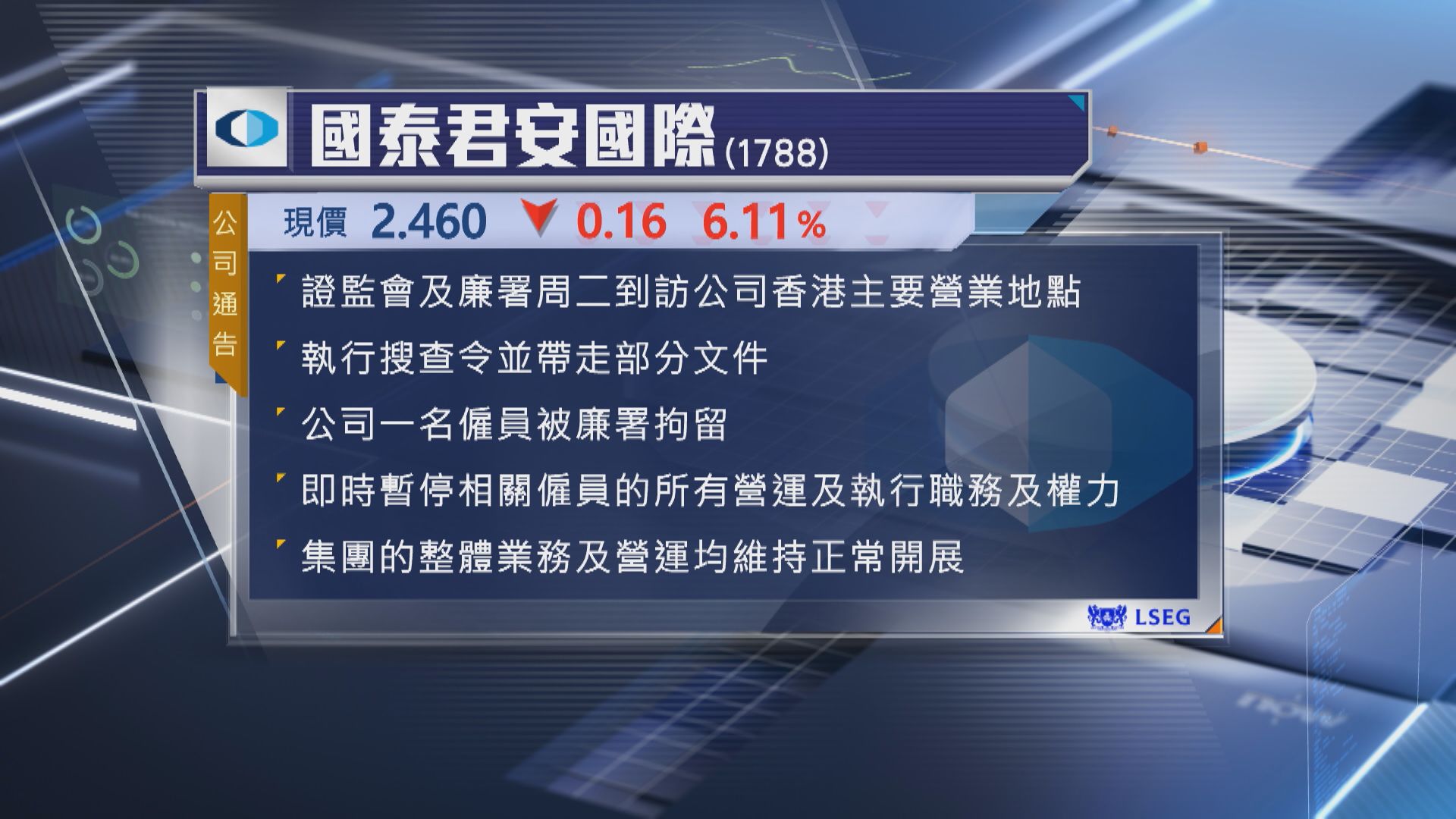【Now新聞台】國泰君安國際1名僱員遭廉政公署拘留,受消息影響,股價今日(12日)一度挫6.4%,低見2.45元。