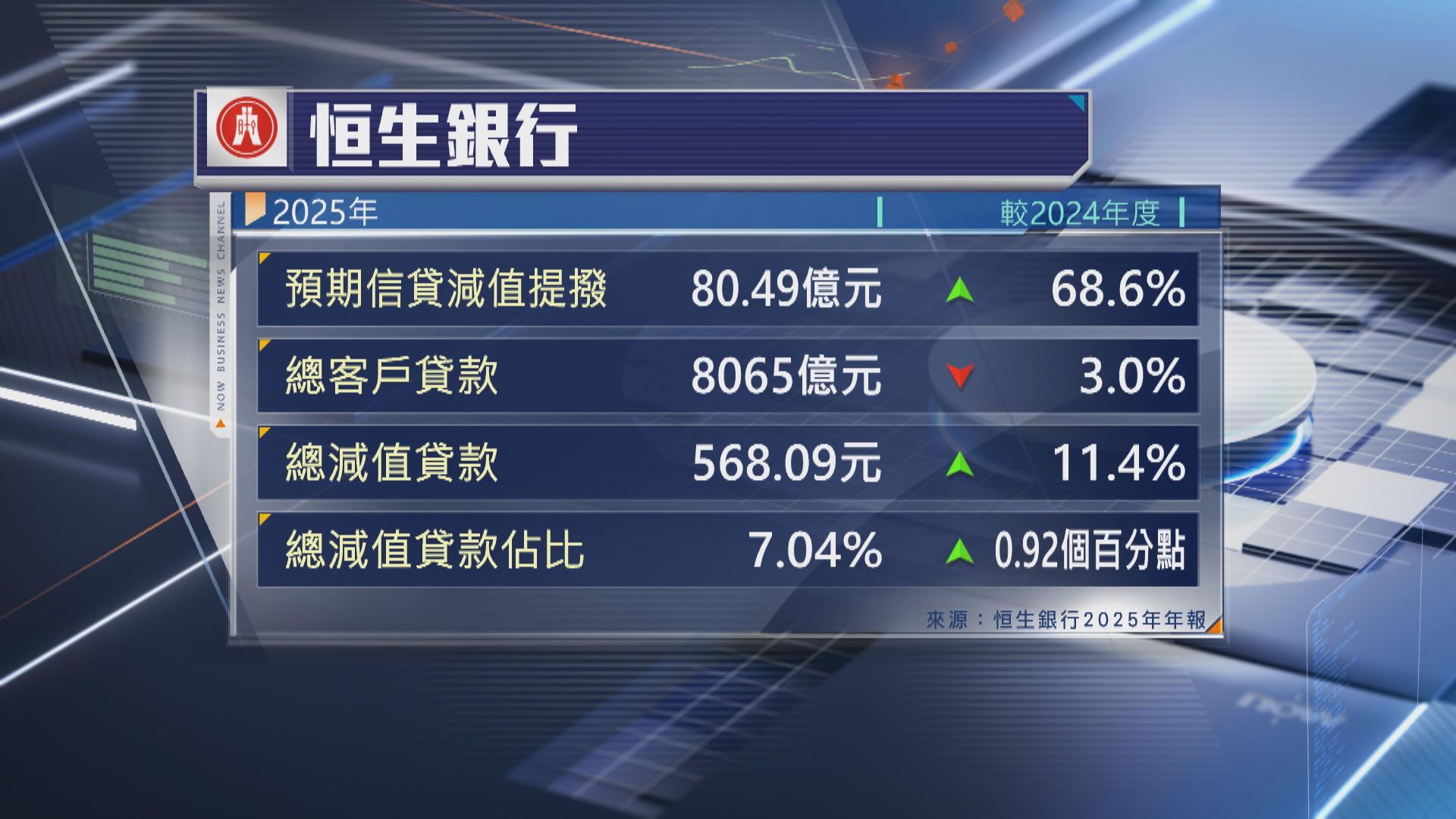【Now新聞台】被私有化後的恒生銀行在年報中披露,去年跟本港商業房地產(CRE)相關的預期信貸減值大增68%。