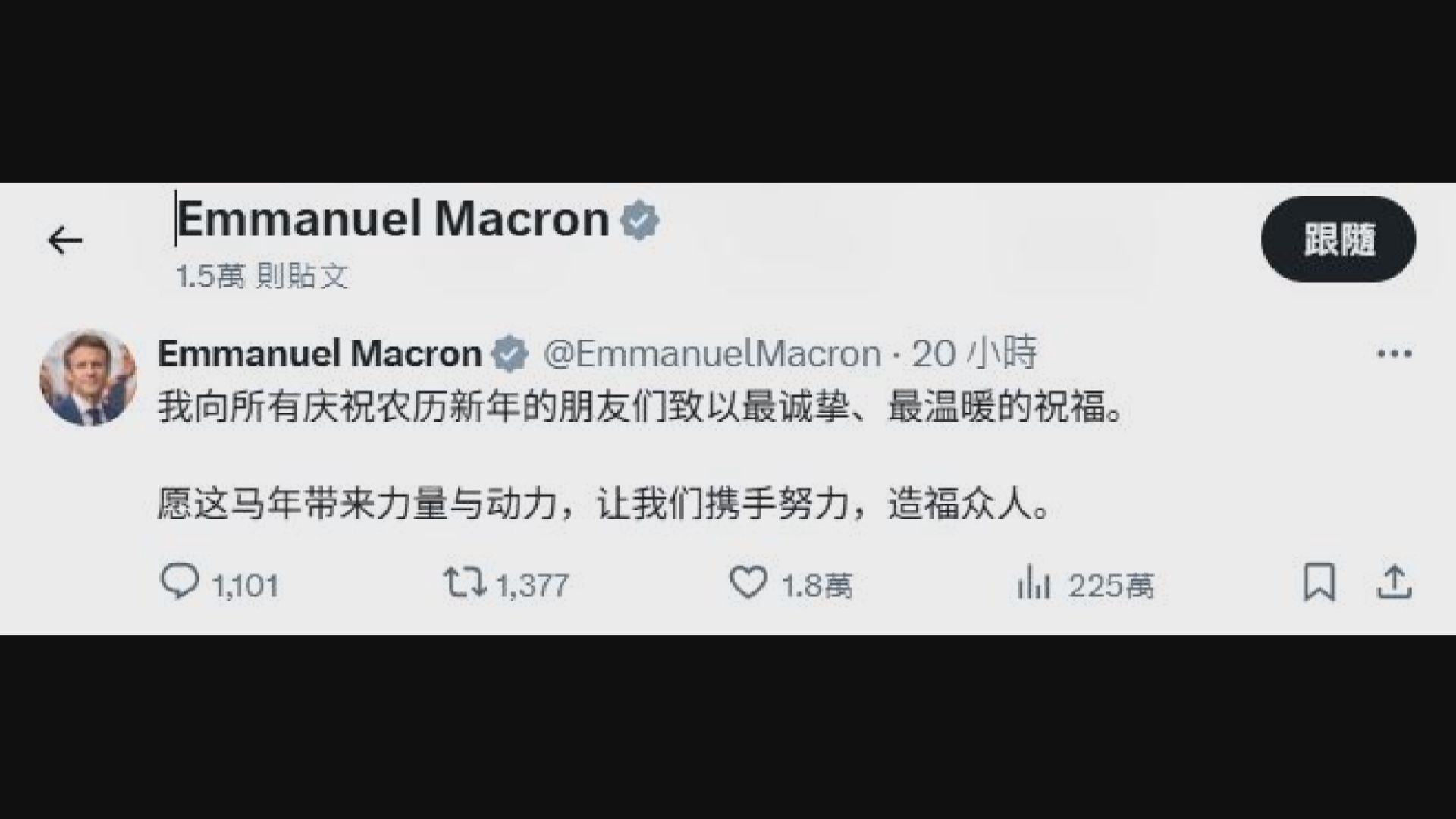 【Now新聞台】法國總統馬克龍在社交平台用中文拜年。