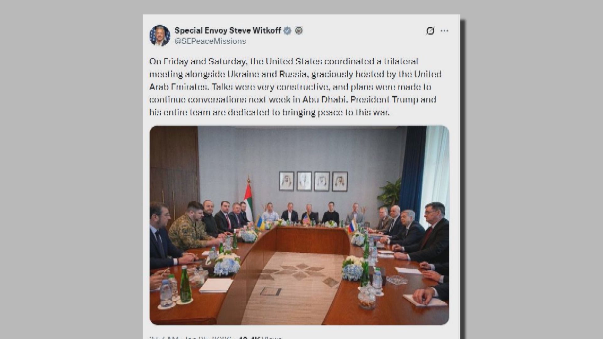 【Now新聞台】美俄烏代表團在阿聯酋阿布扎比舉行的三方會談結束。美國中東問題特使威特科夫稱,三方計劃下周繼續磋商。