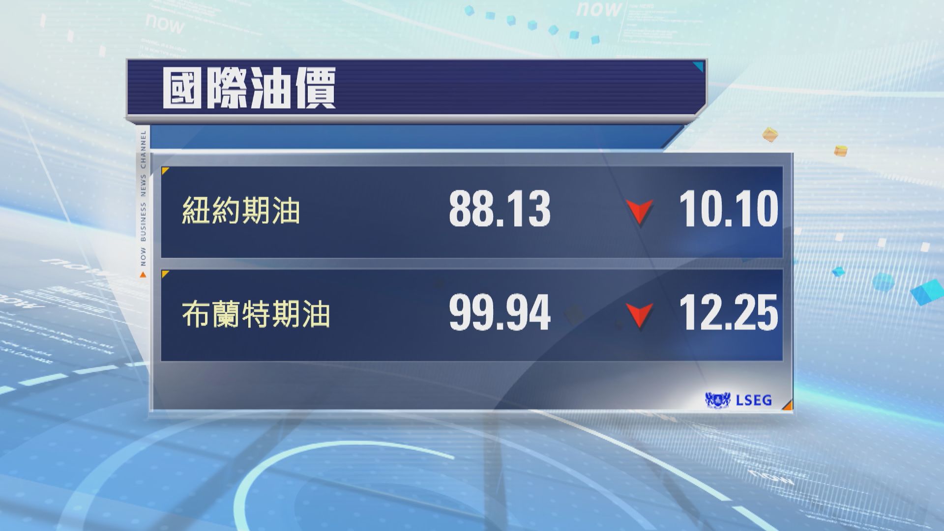 【Now新聞台】國際油價下挫。紐約5月期油收市跌10.1美元,報每桶88.13美元,跌10.3%。倫敦布蘭特5月期油收市跌12.25美元,報每桶99.94美元,跌一成一。