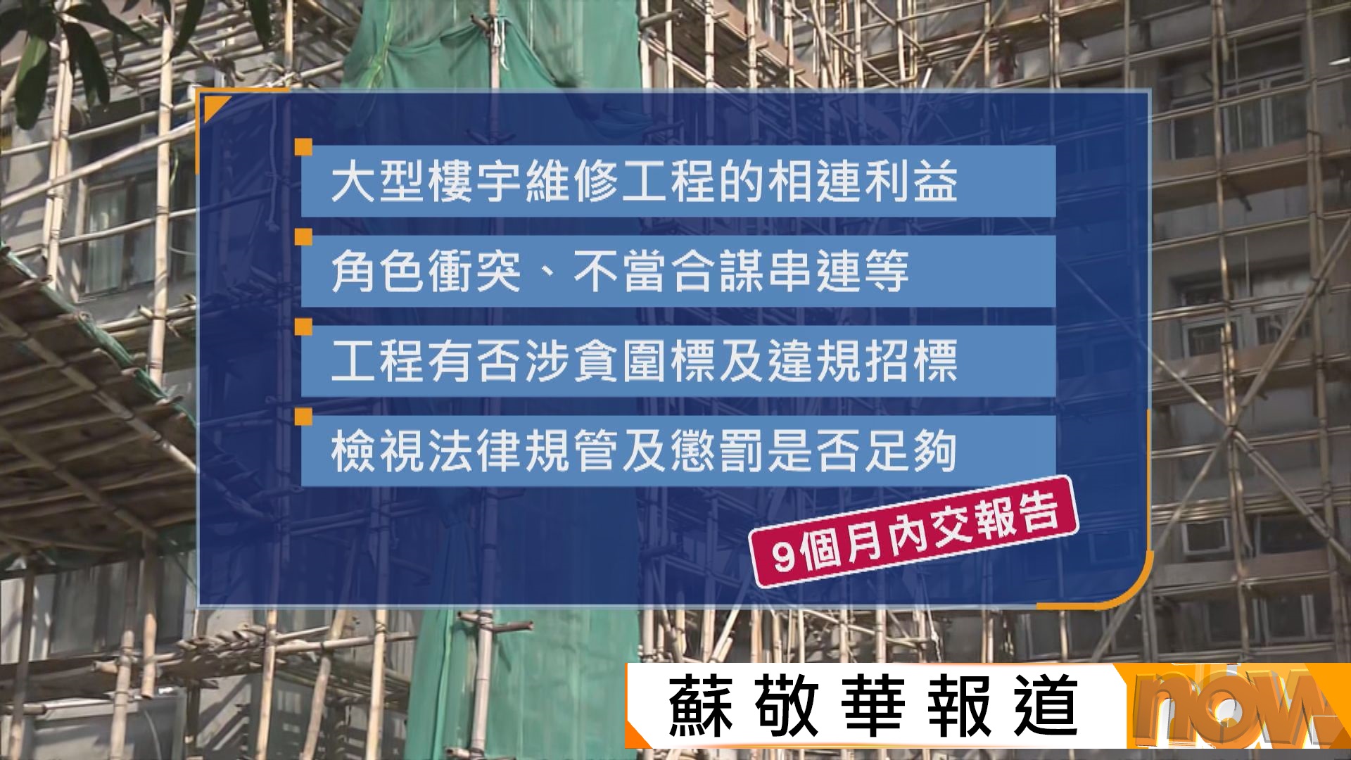 【Now新聞台】建造業議會將會集體採購以及檢測棚網,會尋找有信譽的生產商,雖然會增加額外成本,但相信承建商以及公眾都願意承擔。