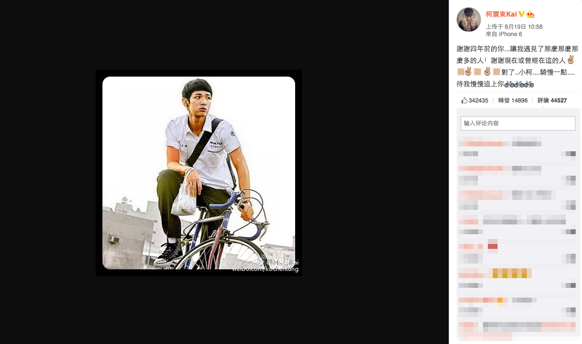 昨日柯震東在微博貼相發文,紀念自己出道已經四年,他留言感謝支持他的人,又話要慢慢追上以前的自己,似乎想要復出。柯震東說:「謝謝四年前的你⋯讓給我遇見了那麼那麼那麼多的人!謝謝現在或曾經在這的人。對了⋯小柯⋯騎慢一點⋯待我慢慢追上你」又晒出一張《那些年》騎單車的劇照,網友都紛紛留言支持,亦有報道指柯震東趁四周年貼出成名作舊照,似要為復出做準備。