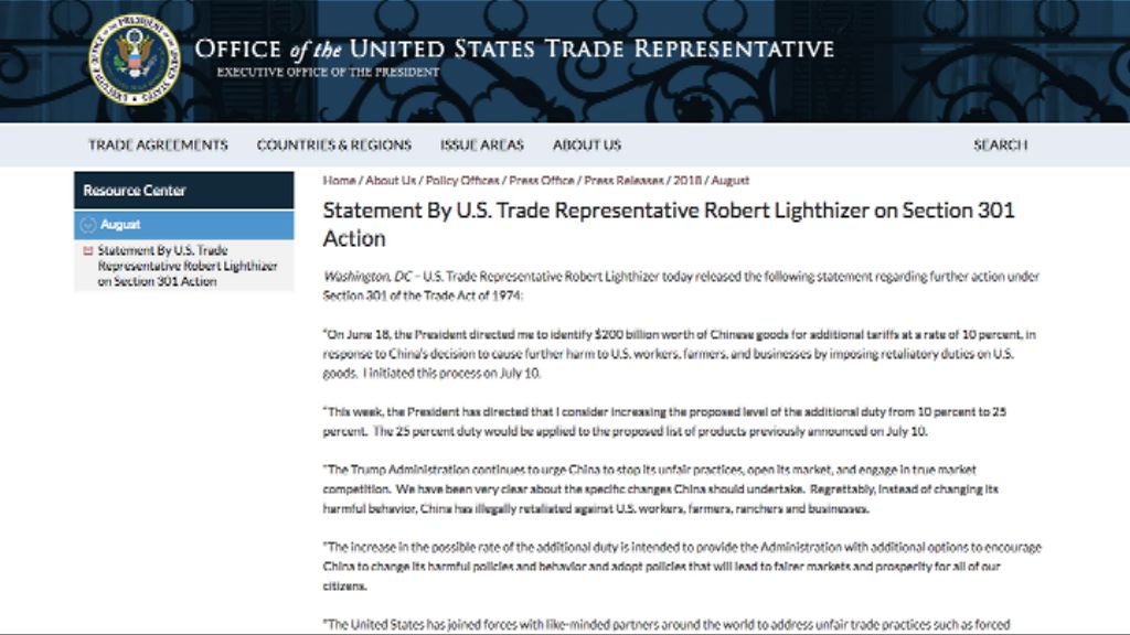萊特希澤發表聲明,指收到特朗普的指示,說中國向美國的工人農民和企業作出非法報復。特朗普同時要求將提高關稅稅率徵求公眾意見,新關稅公眾諮詢期由本月30日延長至9月5日,關稅最早可能在下月實施。
